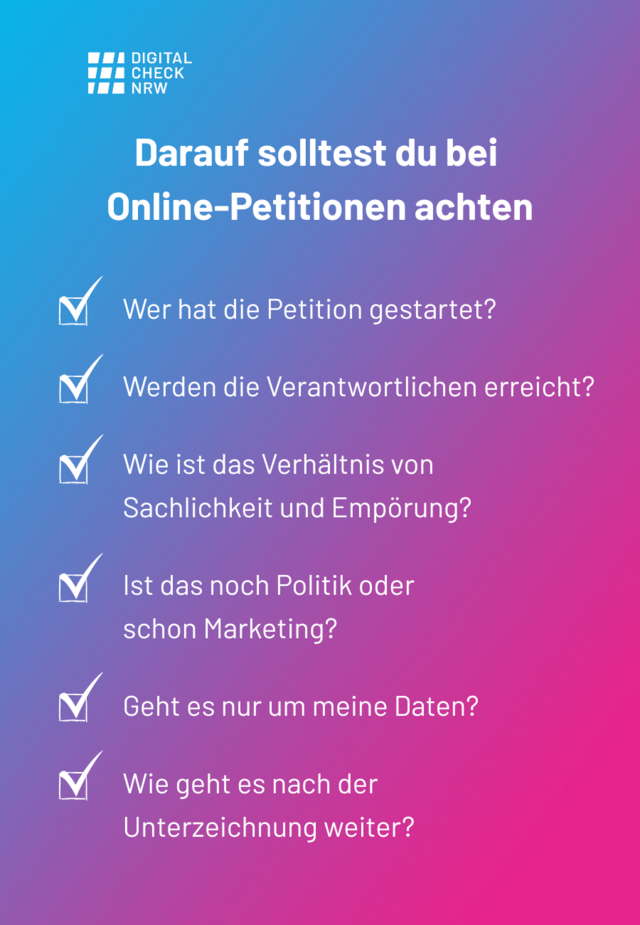 Es kommt natürlich darauf an, wofür genau du dich einsetzt. Setzen sich Bürger*innen beispielsweise für Gesetze und Verbote ein, die freiheitlich-demokratische Grundrechte einschränken, dann ist das zwar – solange das Grundgesetz beachtet wird – ihr Recht, aber im Sinne der Demokratie natürlich keine gute Entwicklung. Viele Menschen klicken im Internet außerdem oft zu schnell und lassen sich von Emotionen leiten, ohne sich richtig mit den Themen oder dem Hintergrund zu beschäftigen. Sobald eine Petition unterschrieben ist, wird gedanklich ein Haken dahinter gemacht, da man seinen Beitrag als geleistet ansieht. Wenn man sich nicht ausreichend Zeit dafür nimmt, kann es auch passieren, dass man Petitionen unterstützt, hinter denen Personen, Gruppen oder Parteien stehen, die man eigentlich nicht unterstützen würde. Oftmals muss eine Petition schnell gehen, zum Beispiel um eine Entscheidung zu stoppen oder ein Eilverfahren zu bewirken. Es ist nicht immer möglich, alle Hintergründe einer Petition zu kennen, aber es gibt Unterschiede zwischen Petitionen – manche sind realistischer und haben bessere Chancen auf Erfolg, während andere im Sande verlaufen und für Politiker*innen und Gesetzgeber nicht relevant genug sind, um beachtet zu werden.