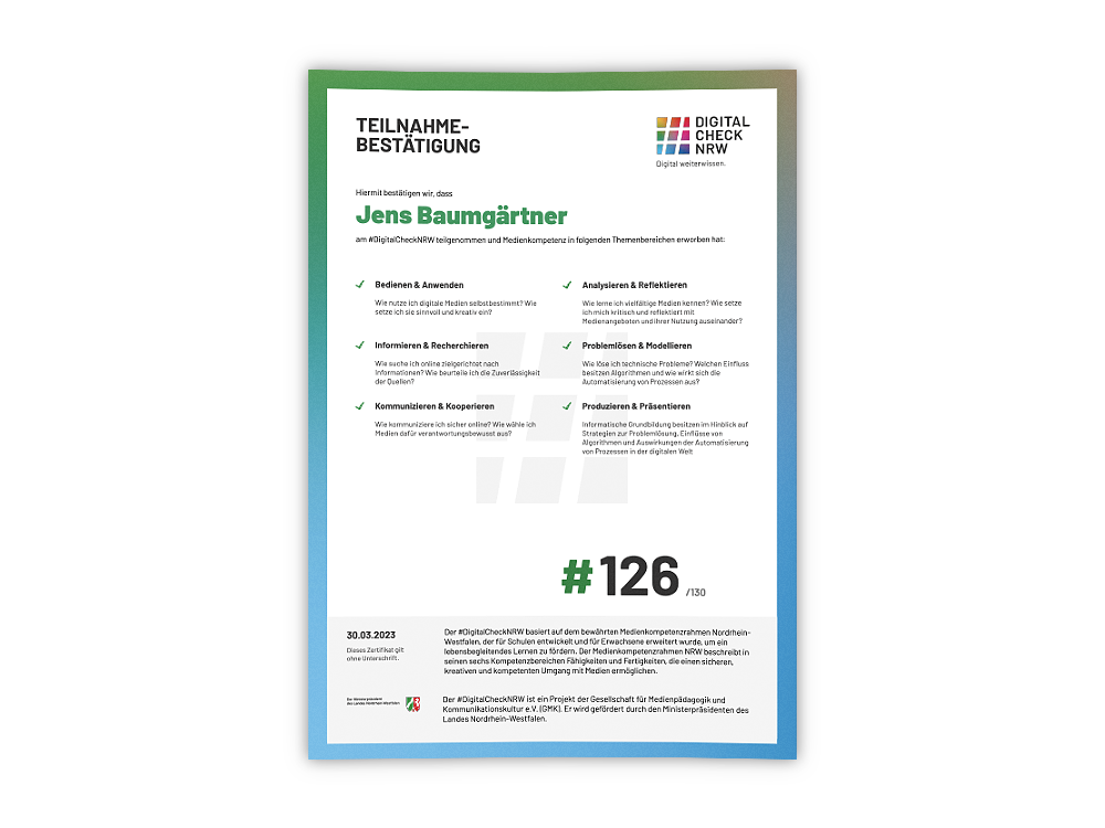 Über den Check könnt Ihr eure eigene Medienkompetenz prüfen und durch passendes Weiterbildungsangebot noch vorhandene Lücken schließen.